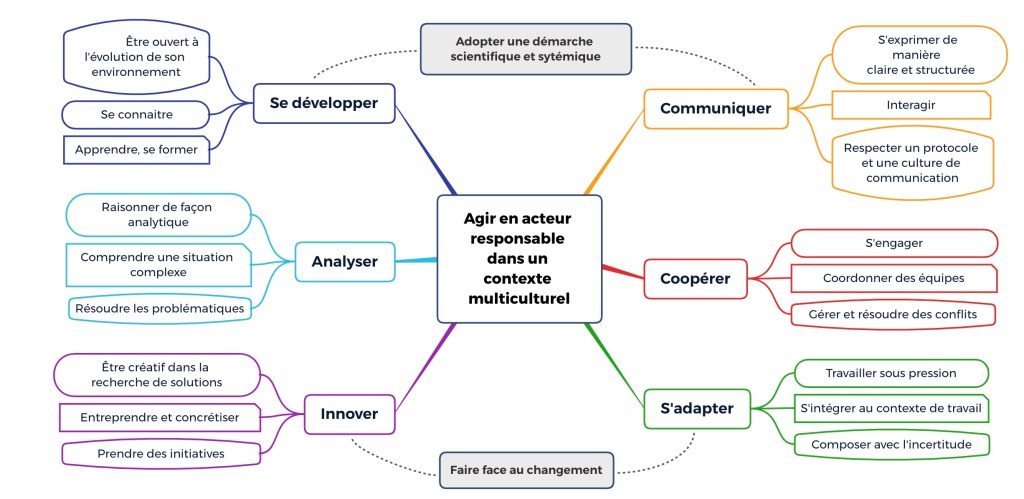 Ce schéma, créé au cours de mon analyse sur ma pratique d’artiste pédagogue en éducation interculturelle, figure dans la troisième partie de mon mémoire (2020). Il met permet de rendre compte de l’ensemble des compétences mises en oeuvre et mobilisées dans différents postes de travail. (éducatrice, formatrice, metteure en scène, coordinatrice).